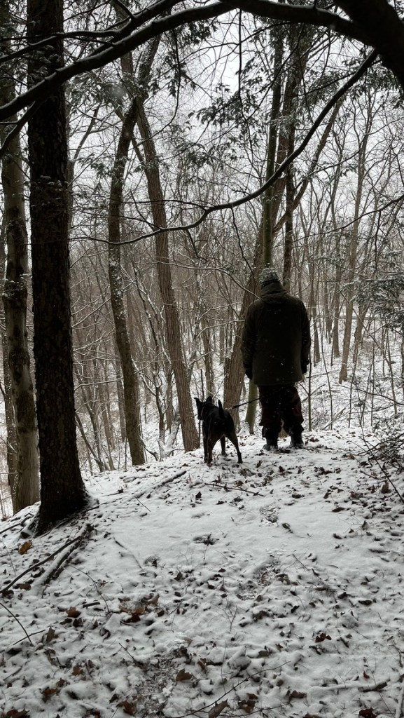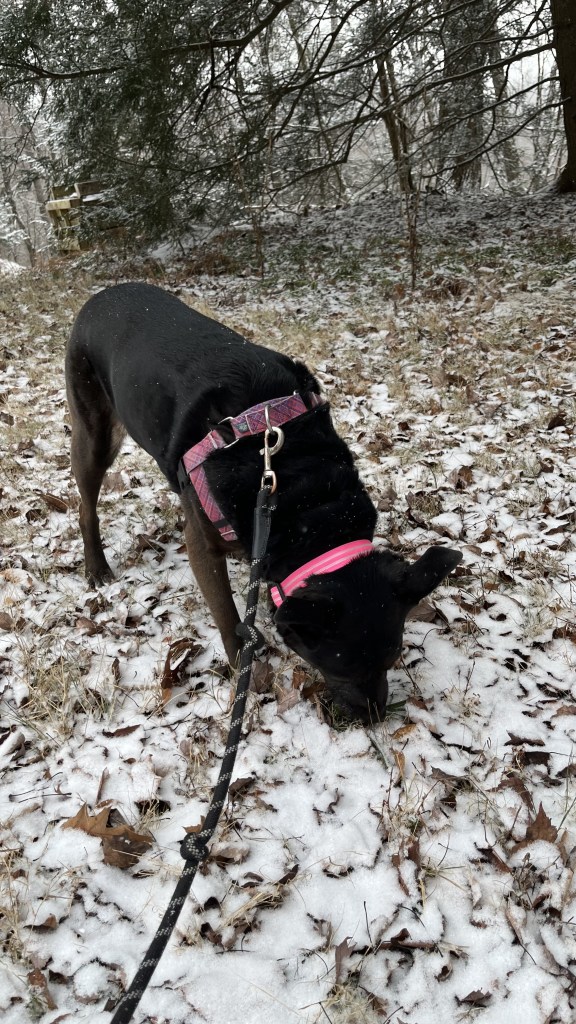 On weekends, when there’s more daylight, we like to venture out to the nearby woods for short walks. Those outings are fun and often beautiful, but they require some vigilance on my part. Feebee has two habits that keep me on my toes: